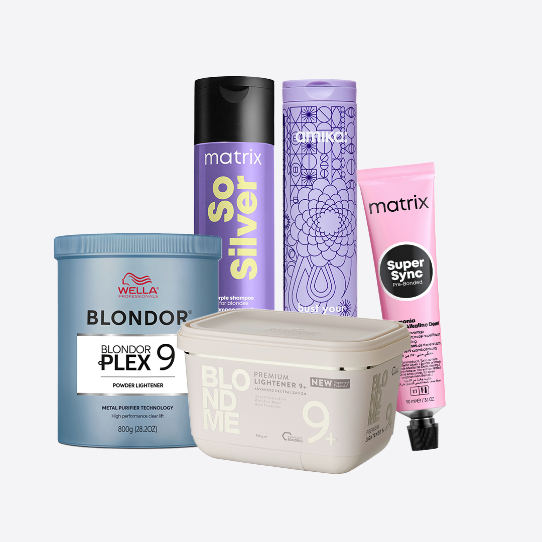 Här hittar du allt för blont hår – samlat på ett ställe. Vi har samlat produkter för blekning, nyansering, vård och underhåll, för både salongsbehandling och vidareförsäljning till kund.